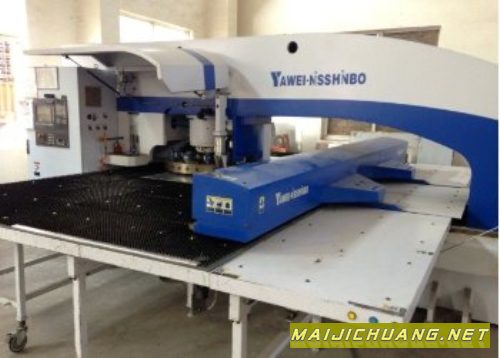 2014年亚威数控转塔冲床,型号HPI-3048-36LA2最大加工板材厚度:碳钢板6.35mm,不锈钢板4mm;一次冲孔最大直径88.9mm;模位数36/40;冲孔精度:±0.1mm;每分钟冲程次数1000cpm;板材最大移动速度:X=75m/min,Y=70(102)m/min;转盘速度30r/min;控制轴数:5(X,Y,Z,T,C);总功率24kW;气源0.6MPa。另外,还拥有以下主要特点:O形机架设计;厚转塔结构,导向更好;常啮合旋转模位,精度、效率更高;下模快速装卸;主要部件(转盘部件、旋转模组建、减速箱等)由日清纺公司提供;德国H L高速液压冲头液压系统,SIEMENS数控系统等一流配置;滚轮功能。